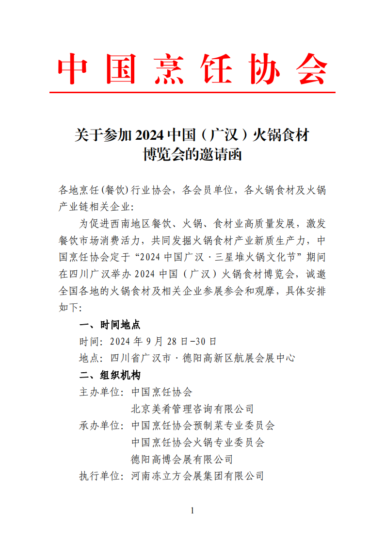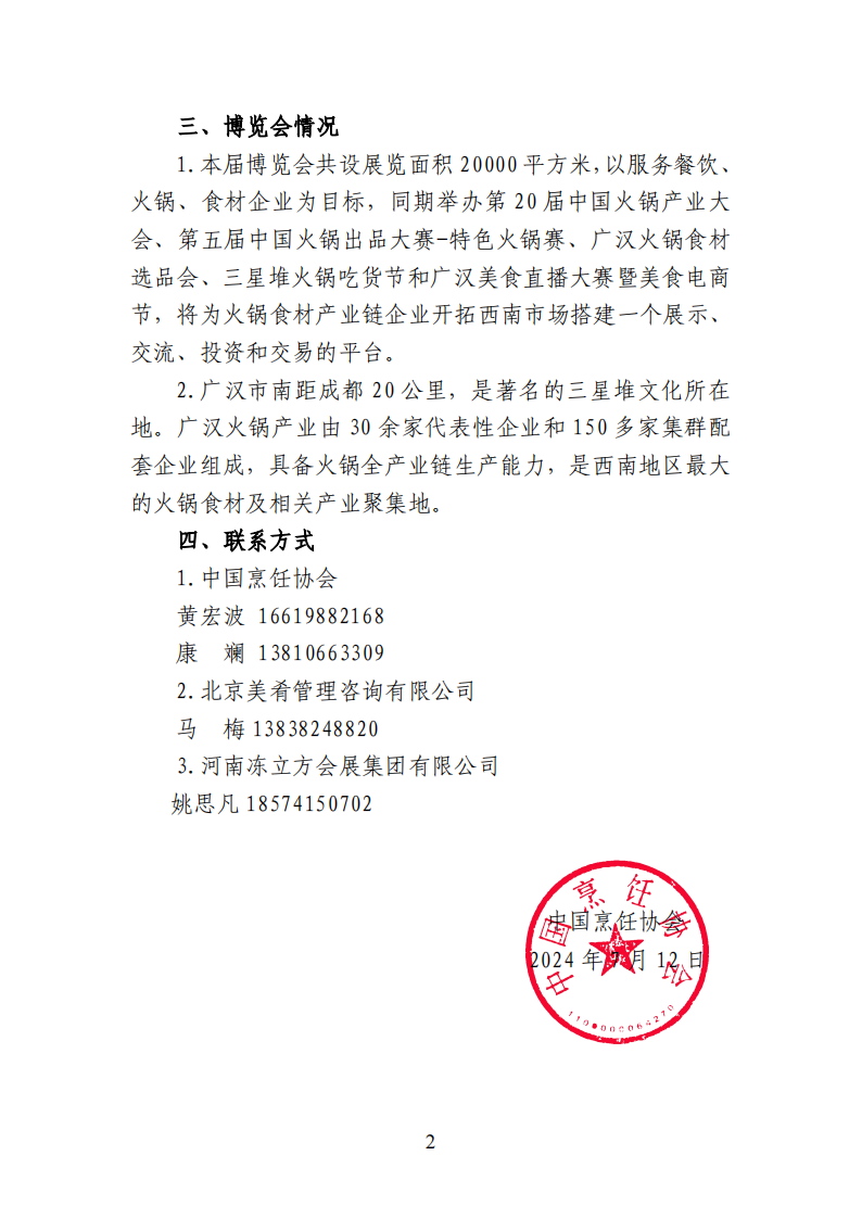 本屆博覽會共設展覽面積 20000平方米,以服務餐飲、火鍋、食材企業為目標,同期舉辦第20屆中國火鍋產業大會、第五屆中國火鍋出品大賽-特色火鍋賽、廣漢火鍋食材選品會、三星堆火鍋吃貨節和廣漢美食直播大賽暨美食電商節,將為火鍋食材產業鏈企業開拓西南市場搭建一個展示、交流、投資和交易的平臺。