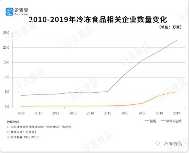 從企查查截取的“2010—2019年冷凍食品相關企業數量變化”中,可以看出,這十年來: